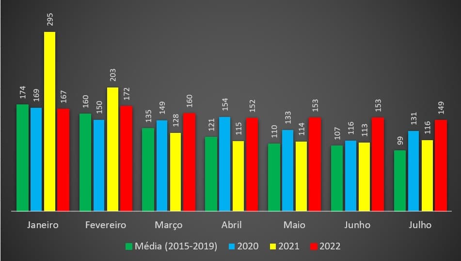 O valor da mortalidade acumulada dos mais idosos em 2022 excede, por agora, em pouco menos de uma centena (97) os números do ano passado (30.551 óbitos). Encontram-se também substancialmente acima do primeiro ano da pandemia (27,866 óbitos) e são muitíssimo superiores ao período pré-pandemia (25.493 óbitos em média entre 2015 e 2019).