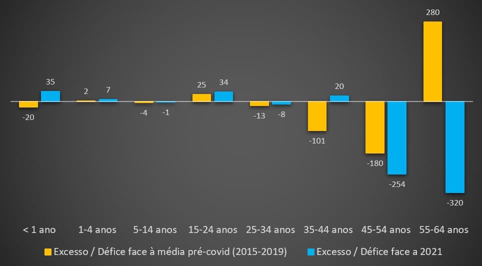 Assim, no grupo dos menores de 1 ano, dos 1 aos 4 anos, dos 5 aos 14 anos, dos 25 aos 34 anos, dos 35 aos 44 anos e dos 45 aos 54 anos – ou seja, com excepção do grupo dos 15 aos 24 anos (situação que deveria ser também investigada) –, a pandemia não teve qualquer impacte, ou até mesmo paradoxalmente “positivo”. A mortalidade foi mesmo inferior. No caso dos menores de 1 ano, a redução até foi de 22% (na realidade um pouco menor, porque a taxa de natalidade desceu).