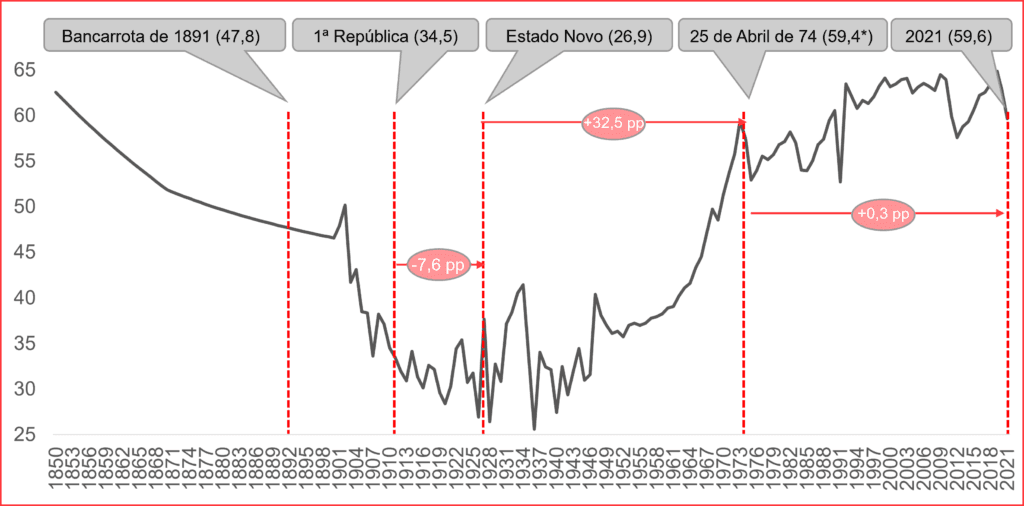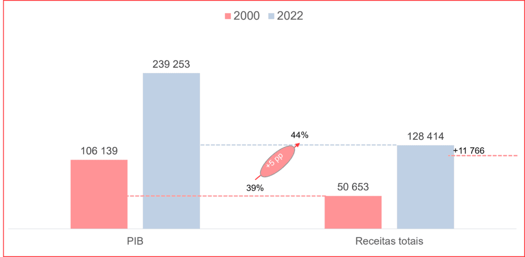 Há 22 anos, precisamente em 2000, o assalto do Estado ao nosso bolso situava-se em 39% do PIB, quando agora é 44% do PIB. Estes 5 pontos percentuais permitiram uma pilhagem adicional de 11,8 mil milhões, algo como 1.140 Euros por português – incluindo crianças e idosos – ou 4.570 Euros por uma família de 4 pessoas!