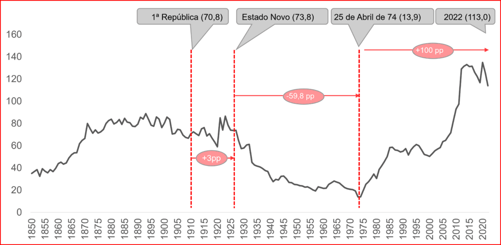 A “democracia” alcançou este “notável feito” – convergência de 0,3 pontos percentuais – recorrendo a um endividamento público sem paralelo. Enquanto o Estado Novo deixou uma dívida pública que representava 13,9% do PIB em 1974, baixando-a em 60 pontos percentuais em relação ao final da Primeira República, a “democracia” subiu-a em 100 pontos percentuais, encontrando-se agora acima dos 110% do PIB – 272,6 mil milhões de Euros no final de 2022 vs. um PIB de 239,3 mil milhões de Euros.