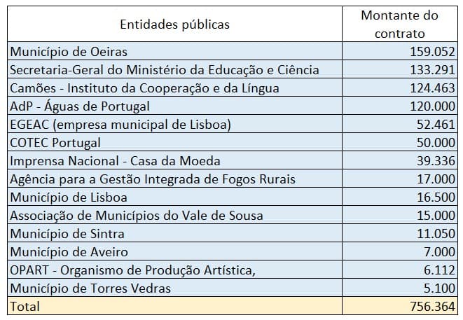 De resto, nas outras entidades destacam-se sobretudo Câmaras Municipais, como a de Lisboa – que, com a EGEAC, assinou contratos de quase 69 mil euros –, de Sintra (11.050 euros), Aveiro (7.000 euros) e Torres Vedras (5.100 euros).
