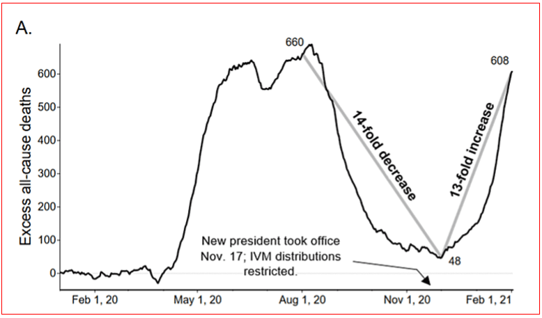 Porém, com a destituição em Novembro de 2020 de Martin Vizcarra, e a chegada ao poder de Francisco Sagasti, que tomou posse no dia 17 daquele mês, toda a estratégia baseada no uso de ivermectina foi abandonada, no decurso de uma forte campanha mediática que diabolizou aquele fármaco, criado pela Merck, mas já sem patente. E, com efeito, de forma quase imediata, como mostram os autores da análise publicada na revista Cureus, a mortalidade total começou a crescer repentinamente até Fevereiro de 2021, conforme um gráfico que apresentam.