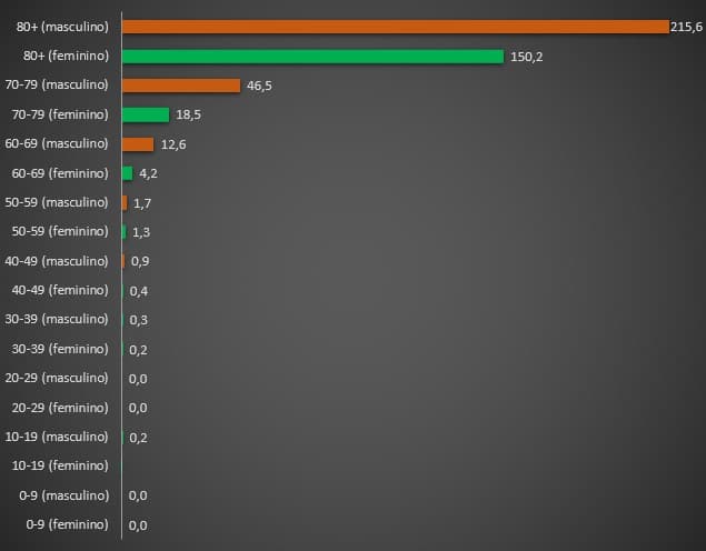 Por exemplo, no mês de Dezembro de 2021 (até ao dia 26) morreram por esta doença 70 homens com mais de 80 anos, sendo que este é um grupo constituído por cerca de 243 mil pessoas. No caso das mulheres – que são mais resistentes –, é certo que morreram em maior número absoluto neste período (99), mas também são muitas mais (cerca de 436 mil pessoas), portanto o risco relativo até foi bastante inferior ao dos homens da mesma idade.