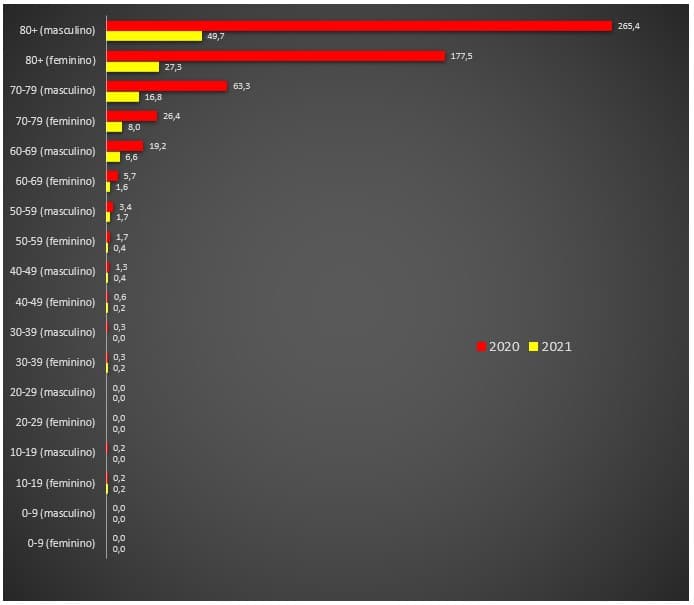 No grupo das mulheres desta faixa etária, a diferença também se mostra muito relevante, embora inferior: de quase 178 no ano de 2020 passou-se para 28 óbitos por 100.000 habitantes em 2021, ou seja, uma redução de 150 vidas por 100.000 habitantes.