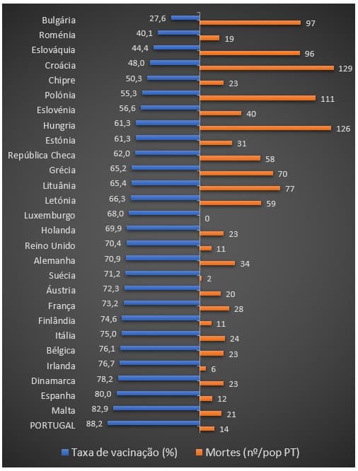 A norma foi uma descida muito significativa. A maior redução relativa registou-se no Luxemburgo, um pequeno país de 630 mil habitantes. No final de 2020, os óbitos diários (padronizados à população portuguesa) foram 84; no final de 2021 nenhum. Outras reduções muito relevantes (superiores a 60%) observam-se em Portugal (71 óbitos em 2020 vs. 14 em 2021), no Reino Unido (70 vs. 11), na Suécia (95 vs. 2), Bélgica (81 vs. 23), Áustria (86 vs. 20), Itália (78 vs. 24), Malta (66 vs. 21), Eslovénia (148 vs. 40).