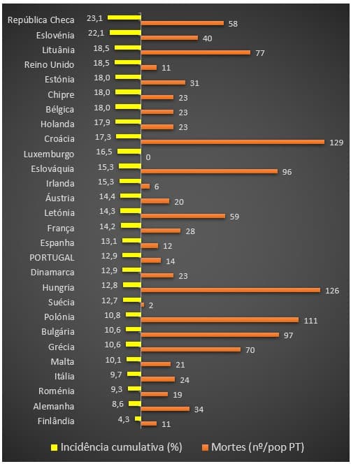 Numa altura em que os óbitos por esta doença em Portugal se situavam nos 14 por dia (média móvel de sete dias), três países superavam os 100 óbitos diários (padronizados à população portuguesa): Croácia (129), Hungria (126) e Polónia (111). Mais cinco registavam mais de 50 óbitos: Bulgária (97), Eslováquia (96), Lituânia (77), Grécia (70) e Letónia (59).
