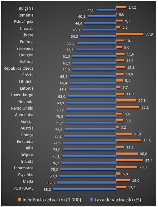 Com efeito, para o período de referência, observa-se que apenas a Espanha, Suécia, Roménia, Letónia, Hungria e Eslovénia apresentavam uma menor incidência (percentagem de casos positivos na sua população) em 2021 do que em 2020. Em alguns casos, a subida foi enorme. Por exemplo, a Grécia tinha uma incidência de 0,07% em 2020 e era de 1,0% em 2021, enquanto na Irlanda aumentou mais de 10 vezes: passou de 0,34%, em 2020, para 3,74%, em 2021. No entanto, a Finlândia – que é, de entre os países da União Europeia, aquele com menor impacte da pandemia em termos de mortalidade – registou nas últimas semanas um aumento muito significativo dos casos positivos. Se em 2020 este país escandinavo tinha, no período em análise, apenas 0,16% da sua população infectada, agora está com 3,48%, sendo apenas ultrapassada pela Irlanda.