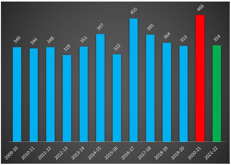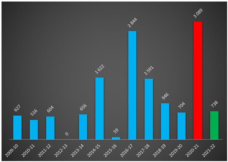 Mesmo assim, esse acréscimo é substancialmente inferior ao Inverno passado (2020-2021), que registou 3.089 óbitos em excesso em relação ao ano de referência, ou seja, mais 147 óbitos em cada dia. E também muito mais baixo do que os números registados nos Invernos pré-pandemia de 2014-2015, 2016-2017, 2017-2018 e 2018-2019.