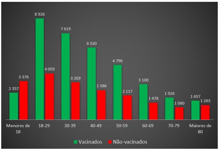 De facto, nos menores de 18 anos, a incidência dos não-vacinados ainda é superior à dos vacinados (3.376 por 100.000 pessoas vs. 2.357), mas inverte-se, de forma evidente, nos grupos etários mais velhos. Nos jovens adultos (18-29 anos), a incidência nos vacinados chega a ser praticamente o dobro face à nos não-vacinados. Nos grupos etários seguintes (30-39 anos, 40-49 anos, 50-59 anos e 60-69 anos), as incidências nos vacinados são ainda superiores: mais 133%, mais 145%, mais 127% e mais 110%, respectivamente.