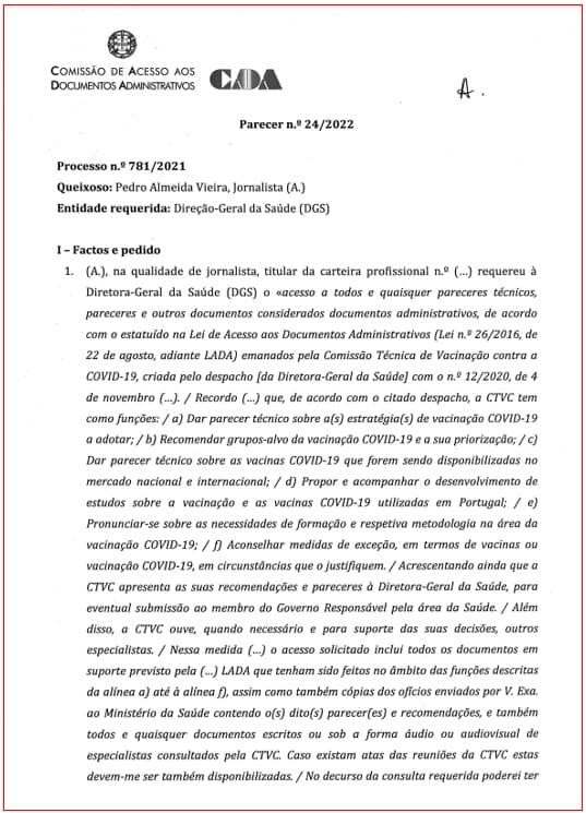 Significa assim que, de acordo com o pedido do PÁGINA UM – considerado legítimo pela entidade presidida pelo juiz conselheiro Alberto Oliveira –, a DGS terá de revelar tanto os pareceres da CTVC, sobre todos os assuntos, como também os ofícios enviados por esta entidade ao Ministério da Saúde, “contendo o(s) dito(s) parecer(es) e recomendações, e também todos e quaisquer documentos escritos ou sob a forma áudio ou audiovisual de especialistas consultados pela CTVC”. Também no caso de existirem actas das reuniões, estas devem ser também disponibilizadas. ↓