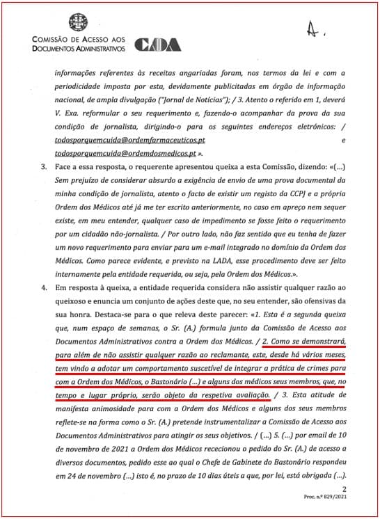 Sendo assim, imaginemos, um autarca, um presidente de um instituto público, um director-geral, um secretário de Estado, um ministro, um primeiro-ministro escrever à Comissão de Acesso aos Documentos Administrativos (CADA) a acusar um jornalista, que lhe solicita documentos administrativos, de estar, “desde há vários meses, (…) a adotar um comportamento suscetível de integrar a prática de crimes para com a Ordem dos Médicos, o Bastonário (…) e alguns dos médicos seus membros”.