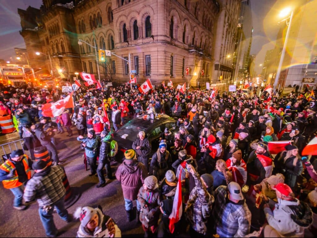 Os protestos, como se sabe, decorreram durante quase 20 dias num confronto sobretudo de palavras. Perante a invasão dos camionistas das ruas de Ottawa, e de outras partes do Canadá, o Governo de Justin Trudeau respondeu sempre com acusações de se estar perante uma minoria extremista e violenta. ↓