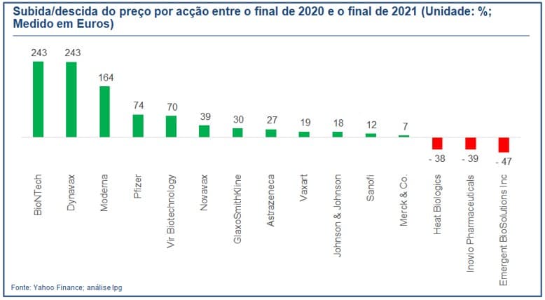 Podemos destacar, desde já, a Novavax, cuja vacina usa uma réplica da proteína S, sintetizada artificialmente do vírus, e que foi apenas aprovada na União Europeia em Dezembro do ano passado. Esta empresa norte-americana viu a cotação das suas acções em bolsa subir 2.450%! De 3,98 USD por acção para 111,51 USD por acção, num espaço de apenas um ano. Um investimento de 100 USD no final de 2019 valeria 2.550 USD no final de 2020.