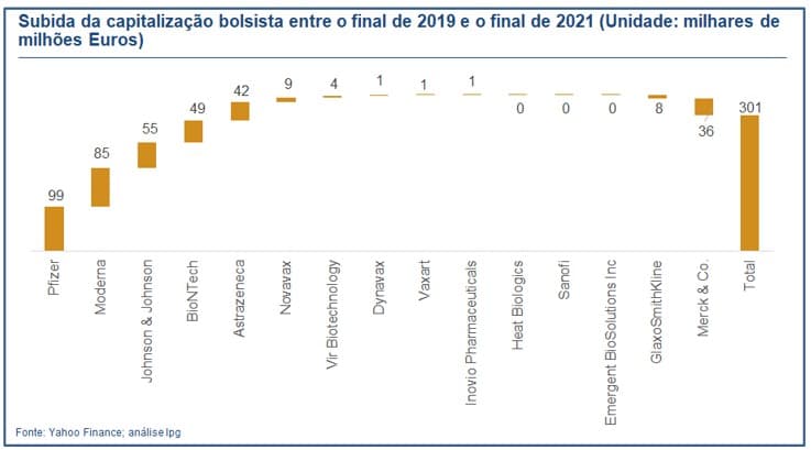 Atentemos agora à evolução da capitalização bolsista destas empresas. Podemos observar que em 2020 e 2021 apenas 15 farmacêuticas registaram uma subida da sua capitalização bolsista superior a 300 mil milhões de Euros, 50% mais que o PIB português e cerca de seis vezes a capitalização bolsista de todas as empresas cotadas em bolsas nacionais.