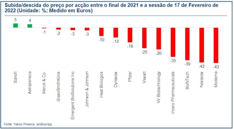 As quedas nas cotações das acções em bolsa da quase generalidade das farmacêuticas associadas às vacinas são disso prova. Podemos observar as quedas vertiginosas que se registam já no presente ano – até ao final da sessão de 17 de Fevereiro – da Moderna, Novavax e BioNTech: 43%, 42% e 39% respectivamente.