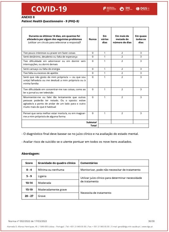 Por exemplo, de acordo com o Anexo 8 da norma da DGS, que inclui a aplicação do PHQ-9, um teste clínico de diagnóstico de depressão, se alguém tiver alterações de humor compatíveis com um valor entre 15 e 28 – que indicia necessidade de tratamento – pode ser também considerada uma vítima de long covid.