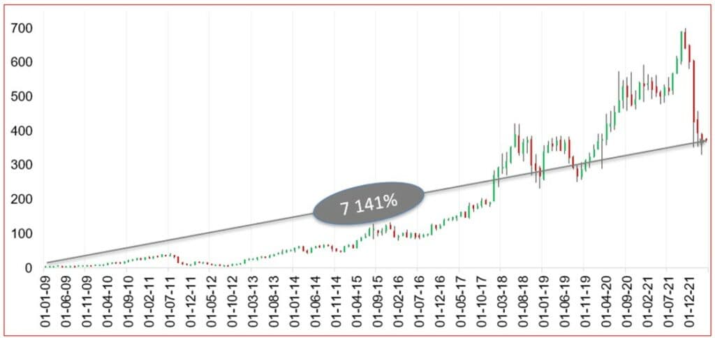 A subida da sua cotação na bolsa de valores norte-americana é do domínio da quinta dimensão: do início de 2009, em que cotava em torno dos 5 USD por acção, à sessão de 25 de Março de 2022, em que encerrou a cotar nos 373 USD por acção, registou uma subida de 7.141%.