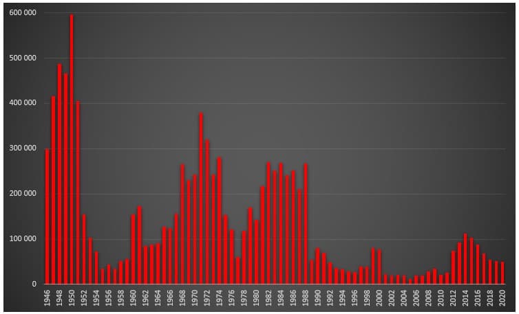 Embora a mortandade causada pelos diversos conflitos regionais tenham apresentado uma tendência decrescente na década de 50 do século passado – entre 1946 e 1950 ainda morreram mais de 2,2 milhões de pessoas em cenário de guerra –, os anos de 60, 70 e 80 registaram um crescimento no número de vítimas, muito por via das guerras no continente asiático e no Médio Oriente, com particular destaque para a Guerra Irão-Iraque.
