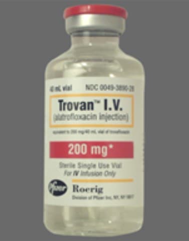 Antibiótico de amplo espectro, a trovafloxacina foi desenvolvida pela farmacêutica norte-americana Pfizer, sob a marca comercial Trovan, tendo vida curta e polémica, antes de ser retirado do mercado por efeitos hepáticos adversos muito graves.