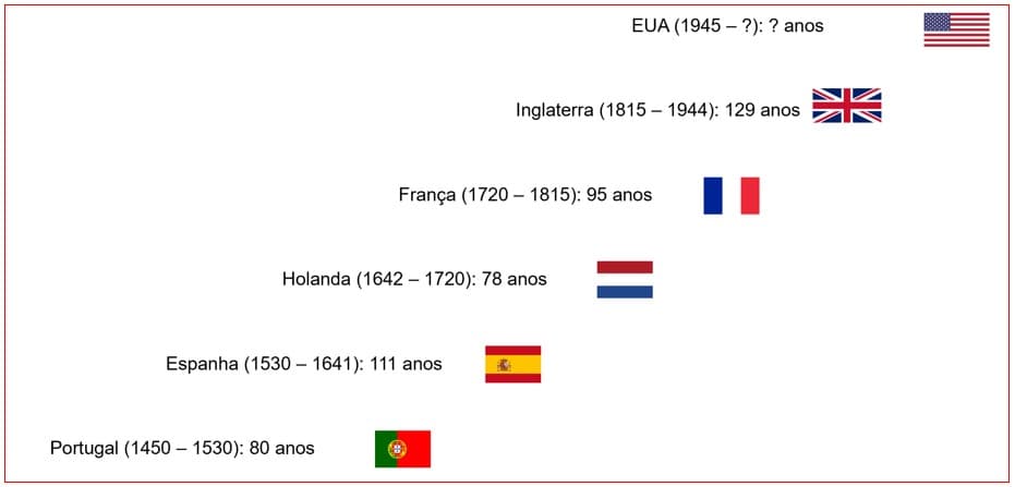 A duração média do domínio desses países, ao longo dos séculos, foi de apenas 100 anos. E o domínio do USD dura há aproximadamente 80 anos.