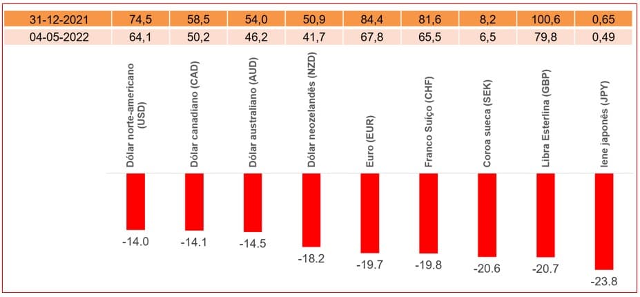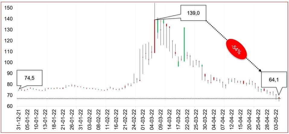 No início do conflito, o USD frente ao Rublo valorizou-se consideravelmente, tendo chegado a atingir os 139 Rublos por 1 USD; mas desde então, o USD caiu mais de 50% frente ao Rublo, tendo cotado na passada quinta-feira no mínimo do ano, em torno de 64 Rublos por 1 USD.