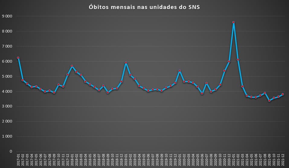 Ora, aquilo que se verificou – pegando nos registos das mortes por todas as causas ocorridas em meio hospitalar – é que, com excepção de um curto período, entre Dezembro de 2020 e Fevereiro de 2021, o SNS não denotou uma sobrecarga. No caso de Janeiro de 2021 houve mesmo um evidente colapso com um recorde de 8.590 óbitos. No período anterior à pandemia – e desde 2017, com informação na base de dados do SNS –, nos piores meses contabilizavam-se cerca de seis mil óbitos em meio hospitalar, sobretudo no mês de Janeiro, estando associado aos surtos gripais (causadores de mais mortes por doenças respiratórias) e ao frio (adjuvante de doenças mortais do aparelho circulatório).