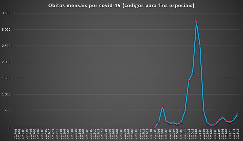 Saliente-se que, na base de dados do SNS, a covid-19 não surge explicitamente como a causa de morte, mas no grupo das doenças catalogada em “Códigos para fins especiais”. A covid-19 e sequelas associadas (código U) são praticamente as únicas doenças mortais inseridas neste grupo, razão pela qual apenas começaram a surgir a partir de Março de 2020.