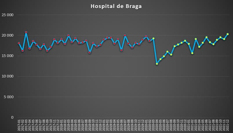 Por fim, o Hospital de Braga foi o único, de entre os seleccionados, que acabou o ano de 2021 com níveis de pressão, medidos em termos de dias de internamento, ligeiramente acima do “normal” antes da pandemia. No mês de Dezembro do ano passado registaram-se 20.294 dias de internamento, o segundo valor mensal mais elevado desde 2017.