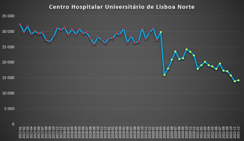O padrão do “vizinho” Centro Hospitalar Universitário de Lisboa Norte – que integra, entre outros, os hospitais de Santa Maria e Pulido Valente – foi idêntico, embora com uma queda ainda mais acentuada após a chegada do SARS-CoV-2, que trouxe uma debandada geral às unidades de saúde.