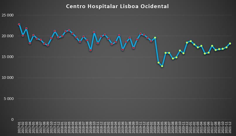 O Centro Hospitalar Lisboa Ocidental destoa deste padrão. Houve efectivamente uma queda abrupta entre Março e Abril de 2020, mas rapidamente se passou para um padrão de “normalidade” pré-pandemia, sobretudo ao longo do ano passado. Porém, até Dezembro de 2021 nunca se chegou a ultrapassar os 20 mil dias de internamento em qualquer mês, algo que sucedeu por vezes no período 2017-2019.