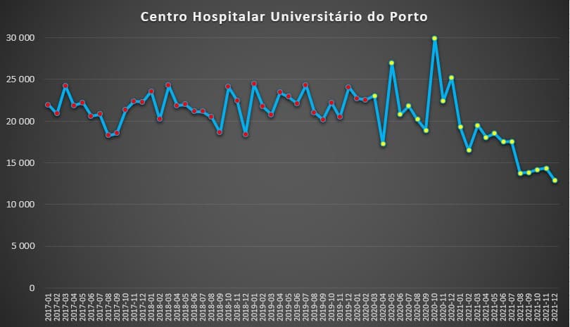 No concelho do Porto observaram-se duas situação muito díspares. No Centro Hospitalar Universitário do Porto, que integra o Hospital de Santo António, registou-se mesmo, após o “susto” inicial de Abril de 2020, um aumento da média de dias de internamento, com um pico em Outubro daquele ano. Porém, a partir de Agosto do ano passado, este indicador desceu para valores bastante baixos, inferiores a 15 mil dias de internamento.