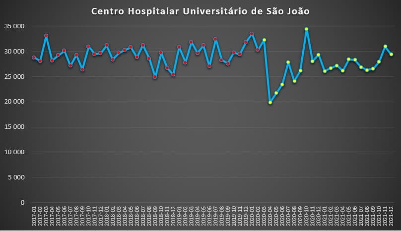 Já no outro hospital da cidade do Porto, o do São João, o cenário foi bastante diferente: apenas os meses de Abril, Maio e Junho de 2020 se registaram dias de internamento abaixo da “normalidade” pré-pandemia, ficando depois sempre em valores sensivelmente idênticos ao período 2017-2019.