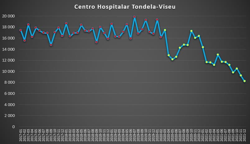 Fora dos grandes centros urbanos, alguns centros hospitalares também mostraram este padrão. Foi o caso do de Tondela-Viseu. Neste caso, a queda de dias de internamento no início da pandemia foi mais curto – apenas entre Abril e Setembro de 2020 –, mas quando se pensava que os valores deste indicador começariam a estar próximos da “normalidade”, houve nova e mais persistente queda. No último mês do ano passado contabilizaram-se apenas 8.241 dias de internamento, uma queda de 58% face ao mês com maior pressão hospitalar desde 2017 (Julho de 2019).