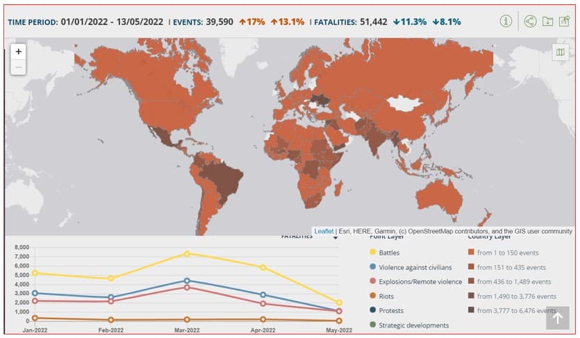 O mapa que decidi incluir aqui, retirado do Armed Conflict Location & Event Data Project (ACLED), mostra as zonas do Mundo onde existem conflitos armados. Hoje. Agora. Neste minuto. Enquanto nós discutimos cada opinião do PCP num conflito para o qual não contribuiu, pessoas morrem nas regiões marcadas a azul do globo. Bem sei que estão todos fora da Europa, mas, ainda assim, estão no mesmo planeta – e, acreditem ou não, naqueles territórios também é século XXI.