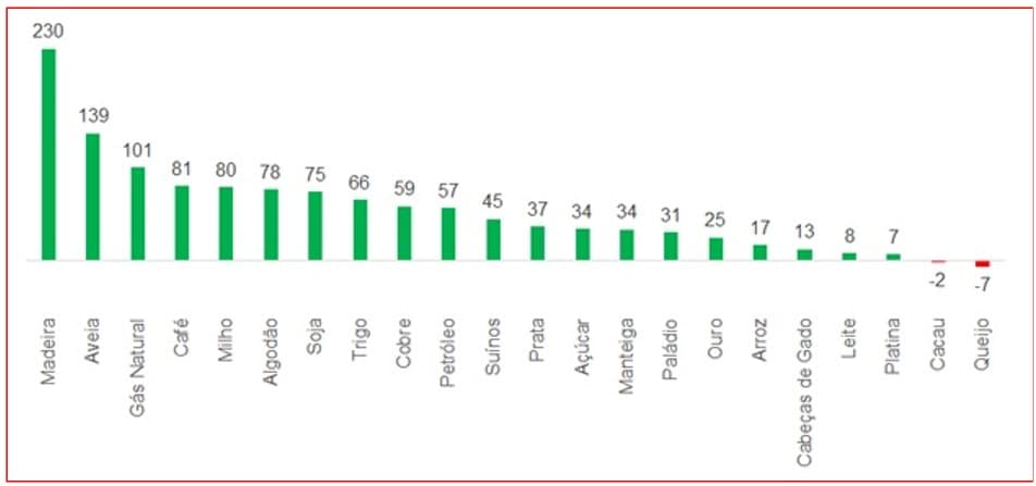 Senão vejamos, o que aconteceu, entre o final de 2019 e o final de Fevereiro de 2022 com algumas matérias-primas. Ou seja, antes da invasão da Rússia à Ucrânia. Chegaram a subir mais de 200%, no caso da Madeira; o Gás Natural subiu 101%, o Petróleo encareceu 57%. Os cereais também registaram fortes subidas: a Aveia cresceu 139%, o Milho 80% e o Trigo 66%.
