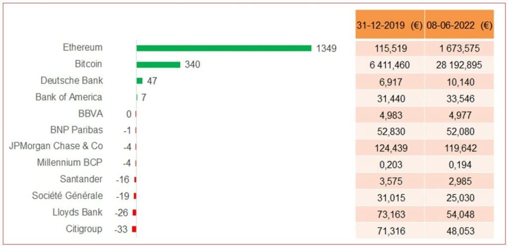 Na prática, é isto o que está a acontecer com toda a massa monetária emitida nos últimos dois anos pelos Bancos Centrais. Já todos repararam, certamente, na subida do custo de vida dos últimos dois anos: comida, preços das casas. E até nos activos financeiros – excepto as acções dos bancos –, incluindo as Criptomoedas, subiram expressivamente e sem cessar.
