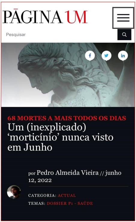 Na verdade, até tenho o inconfessável desejo de que a imprensa mainstream me siga. E, por exemplo, em vez de irem os jornalistas a correr falar com “especialistas”, passem a clamar sim por maior transparência – será que alguém se chocará com o “apagão” da base de dados da Morbilidade e Mortalidade Hospitalar denunciado ontem pelo PÁGINA UM? – e ou chamem a polícia, ou seja, a Procuradoria-Geral da República.