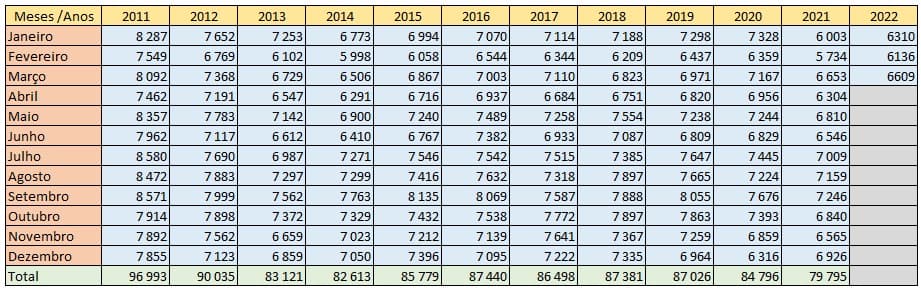 De acordo com os cálculos do PÁGINA UM, a média diária de nascimentos entre Dezembro de 2020 e Março de 2022 – abrangendo os 16 meses com um efectivo impacte, ou influência, da pandemia – situou-se nos 216, variando entre um mínimo de 194, em Janeiro de 2021, e um máximo de 242, em Setembro de 2021.