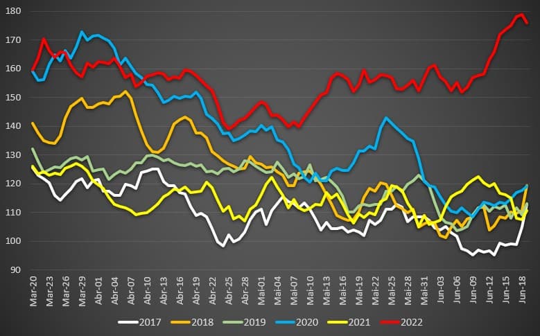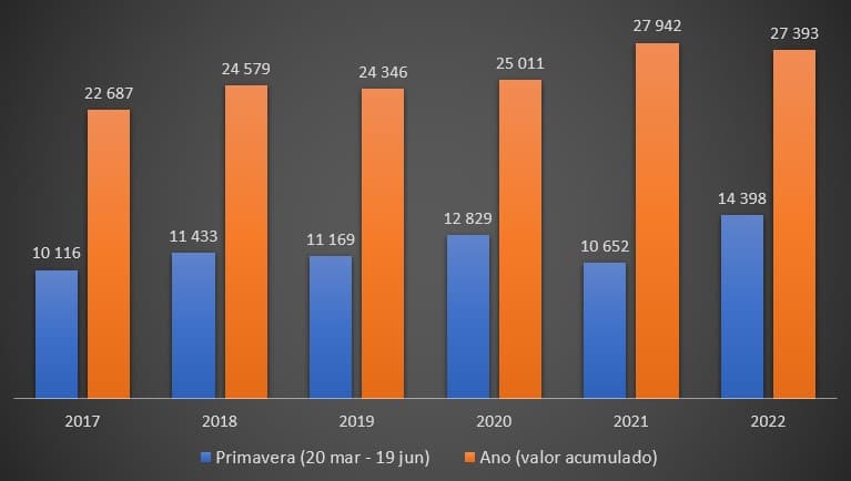 No ano passado, faleceram durante a Primavera, 10.758 pessoas – o segundo valor mais baixo do quinquénio (2017-2021), mas muito em virtude da “sangria” do Inverno. Recorde-se que em Janeiro e Fevereiro de 2021 – quando as mortes por covid-19 chegaram a ultrapassar as 300 por dia e uma parte substancial da população, mesmo idosa, não estava vacinada – os óbitos nos maiores de 85 anos totalizaram os 14.805. Este ano foram “apenas” 10.001.