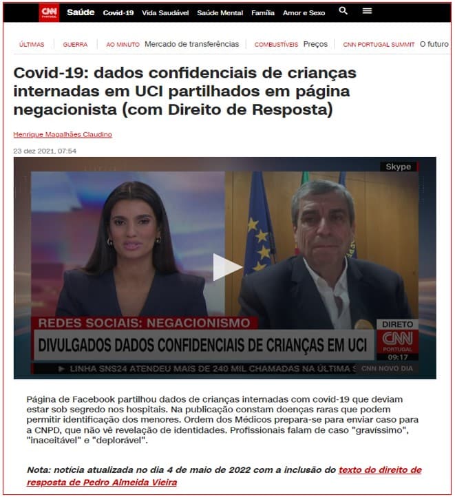 Assinada pelo então jornalista-estagiário Henrique Magalhães Claudino, e intitulada “Covid-19: dados confidenciais de crianças internadas em UCI partilhados em página negacionista“, a notícia acusava o PÁGINA UM, identificando-o indirectamente, de ser “uma página negacionista” e “anti-vacinas”, e que revelara “dados confidenciais de crianças em unidades de cuidados intensivos”.