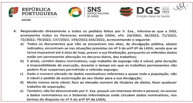 Essas entidades são as seguintes, e divulgamos as cartas: Ministério da Saúde, DGS, Serviços Partilhados do Ministério da Saúde (SPMS) e Administração Central do Sistema de Saúde (ACSS). Caso estas entidades não tenham esses documentos, porque não existem, a lei determina que informem da sua não existência.