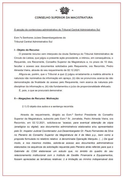 Previsível: o Conselho Superior da Magistratura (CSM) recorreu da sentença do Tribunal Administrativo de Lisboa que determinou a obrigatoriedade em conceder ao PÁGINA UM o acesso aos documentos do inquérito à distribuição da Operação Marquês em 2014.