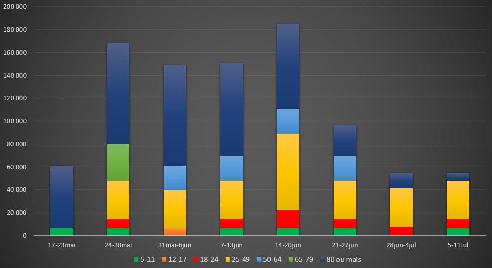 Com efeito, na segunda quinzena de Maio vacinaram-se 21% deste grupo etário, tendo-se depois conseguido, nas quatro semanas subsequentes, vacinar entre 11% e 13% a cada sete dias. Porém, na semana de 21 a 27 de Junho apenas se vacinaram 4%, seguindo-se 2% na seguinte e apenas 1% na semana de 5 a 11 de Julho.