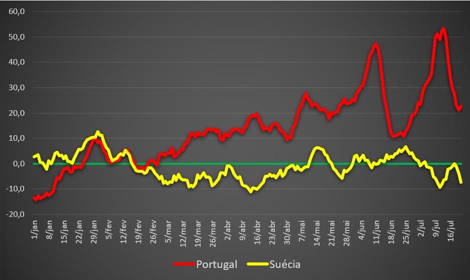 No gráfico que aqui apresento, produzido através de dados oficiais tanto de Portugal como da Suécia, comprova-se as consequências no nosso país das péssimas políticas de Saúde Pública e os efeitos de uma comunicação social que as apoiou acriticamente. Dois anos depois, quando a covid-19 apresenta já uma taxa de letalidade ao nível da gripe, e quando tudo já deveria estar normalizado, Portugal apresenta, desde finais de Fevereiro deste ano, um aterrador excesso de mortalidade acima do período pré-pandemia (2015-2019).