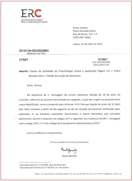 No âmbito da deliberação ilegal pelo Conselho Regulador da Entidade Reguladora para a Comunicação Social – ao arrepio de todos os preceitos legais, cometendo actos absurdos e lesivos, atropelando a defesa do PÁGINA UM numa queixa contra a liberdade de expressão e o jornalismo feita pela Sociedade Portuguesa de Pneumologia, no decurso de um conjunto de artigos de investigação que levaria à abertura de um processo de contra-ordenação do penumologista António Morais e o seu afastamento de consultor do Infarmed –, decidimos divugar a carta integral do advogado Rui Amores enviada na passada sexta-feira ao regulador.