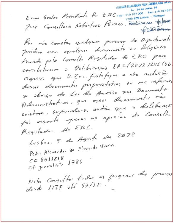 “Hoje, dia 9 de agosto de 2022, um cidadão de nome Pedro de Almeida Vieira dirigiu-se à ERC – Entidade Reguladora para a Comunicação Social sobre [sic] pretexto de consultar processos em que o seu nome está envolvido.