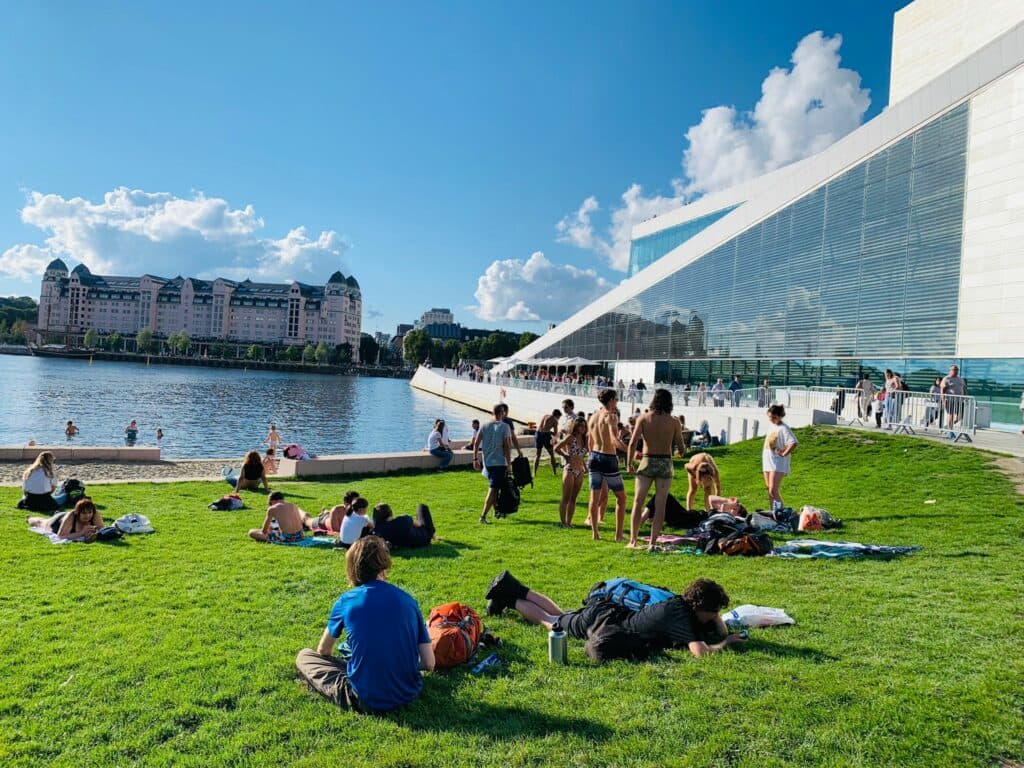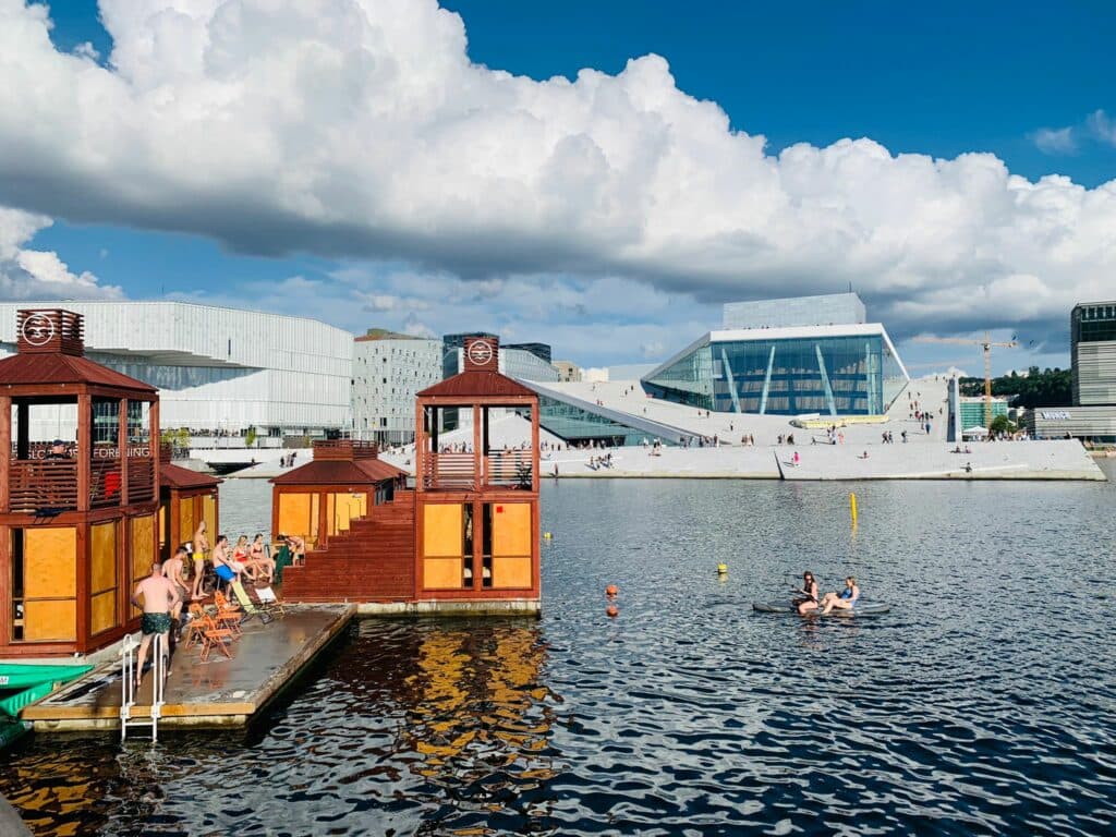 Segui depois a pé até à Ópera e ao Museu Munch, e confirmei que os nórdicos aproveitam qualquer local junto à água para fazer praia. Há ali também plataformas e barcos, que grupos de amigos alugam, com bebidas, e de onde dão mergulhos para o mar.
