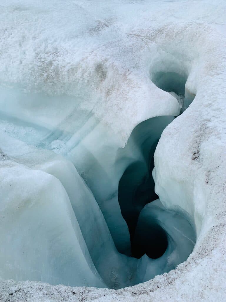 Começou a descida até ao glaciar e, quando chegámos, colocámos a proteção nas botas para descermos o glaciar a pé. É uma sensação boa. Vamos vendo as cavernas de gelo. Frederik reconhece algumas onde já dormiu no Inverno.