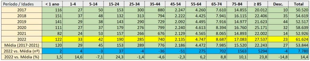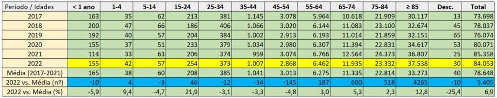 A dimensão dos números de 2022 é tão avassaladora que jamais se pode justificar com base na covid-19, em ondas de calor ou envelhecimento populacional. Aliás, devido à pandemia e ao quase contínuo excesso de mortalidade nos mais idosos, o grupo etário dos maiores de 85 anos até terá diminuído face ao período pré-pandemia.