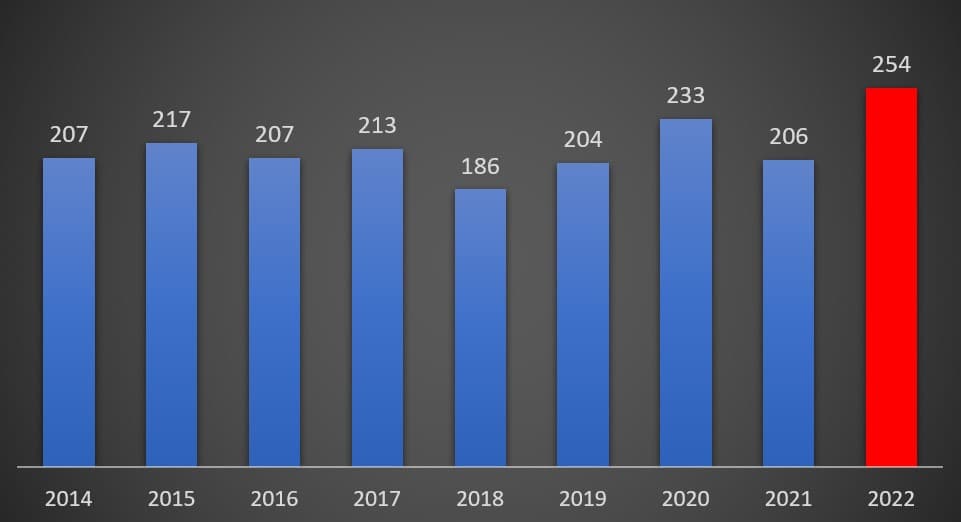 Em Outubro do ano passado chegou aos 297, mas a partir daí tem estado sempre a subir, mostrando uma evolução preocupante. A mortalidade acumulada nos oito meses de 2022 está cerca de 22% acima da média de 2017-2021, conforme divulgou ontem o PÁGINA UM.